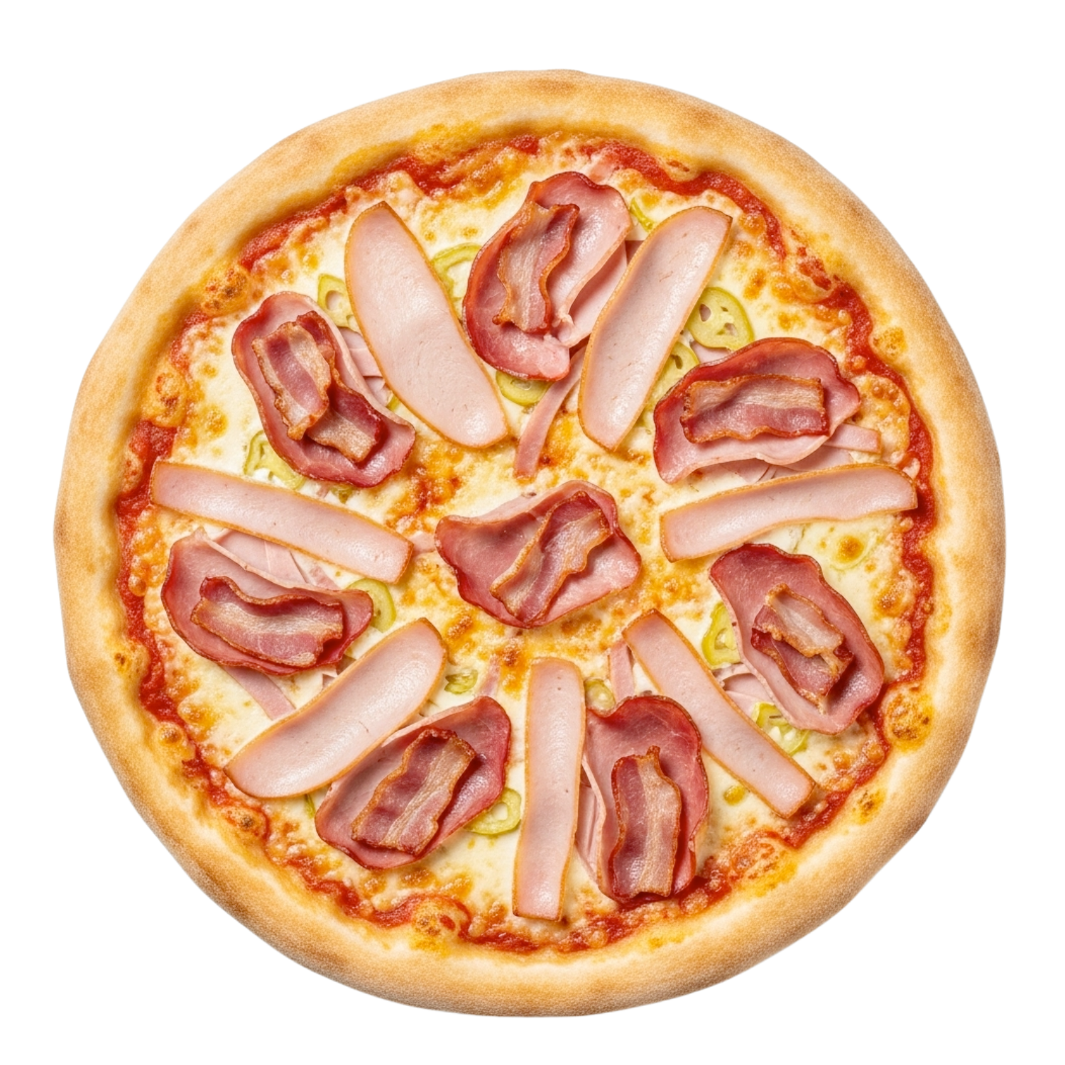 Mozzarella, emmental, jambon dinde, chorizo, lardon.