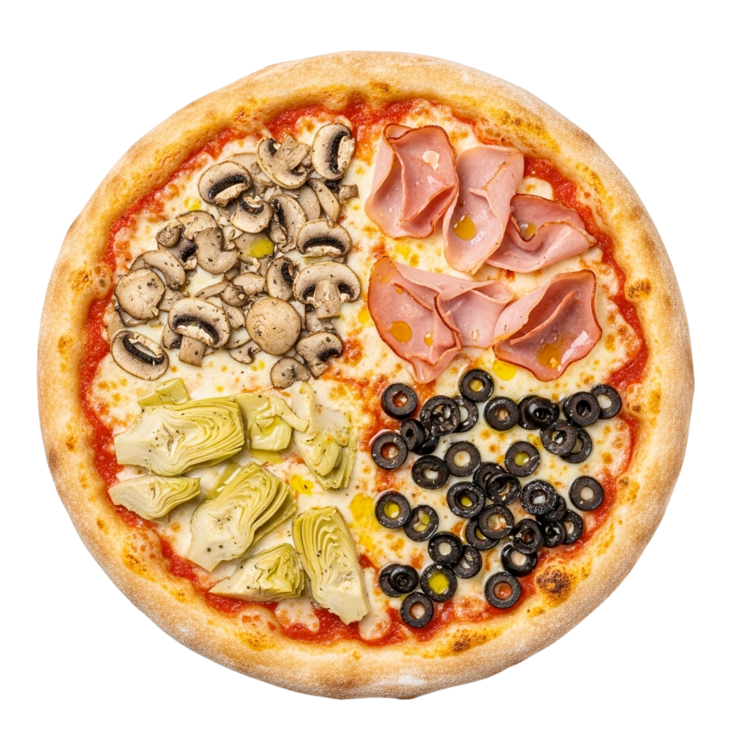 Mozzarella, emmental, champignons, artichauts, poivrons, jambon.