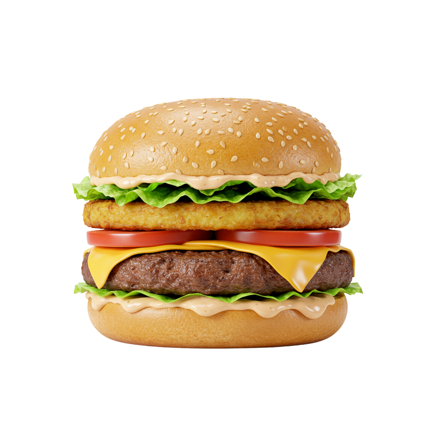 Steak, cheddar, salade, tomates, galette rösti et sauce burger. Servi avec boisson et frites.