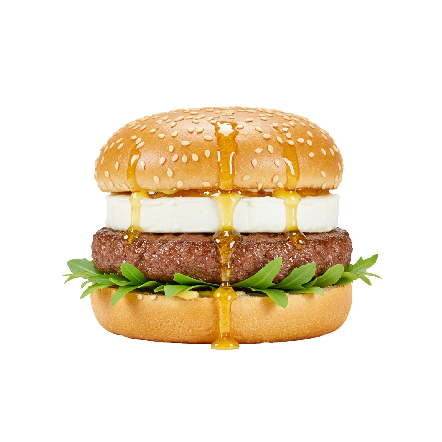 Fromage de chèvre onctueux, miel doux et roquette fraîche, pour un mélange sucré-salé raffiné. Servi avec boisson et frites.