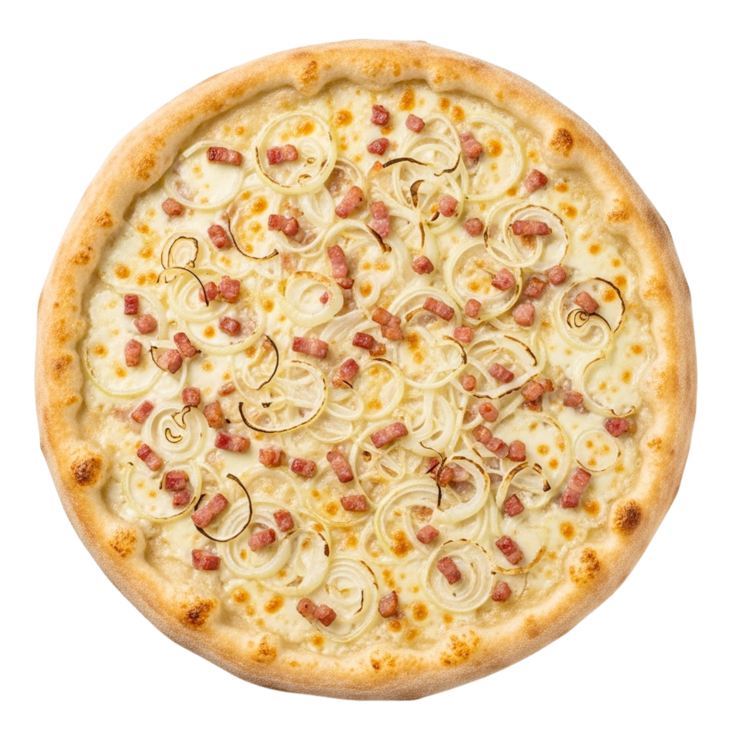 Mozzarella, emmental, oignons rouges, lardon.