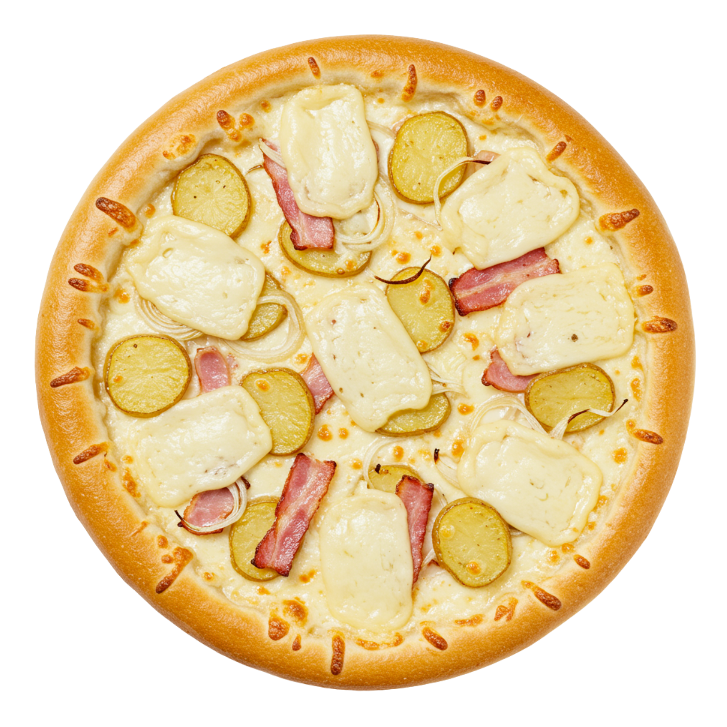 Mozzarella, emmental, raclette, pommes de terre, lardon.