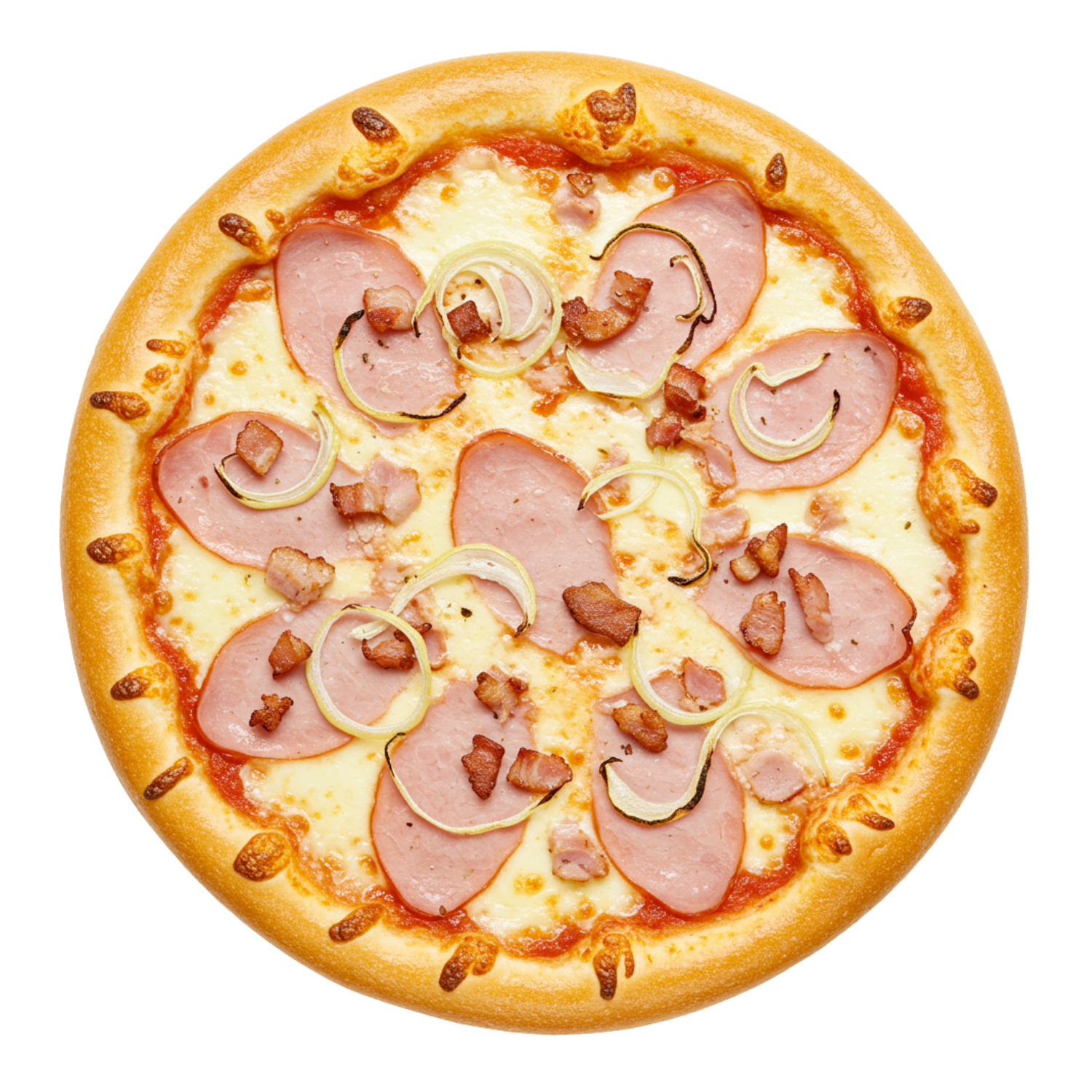 Mozzarella, emmental, jambon dinde, lardon, oignons rouges.