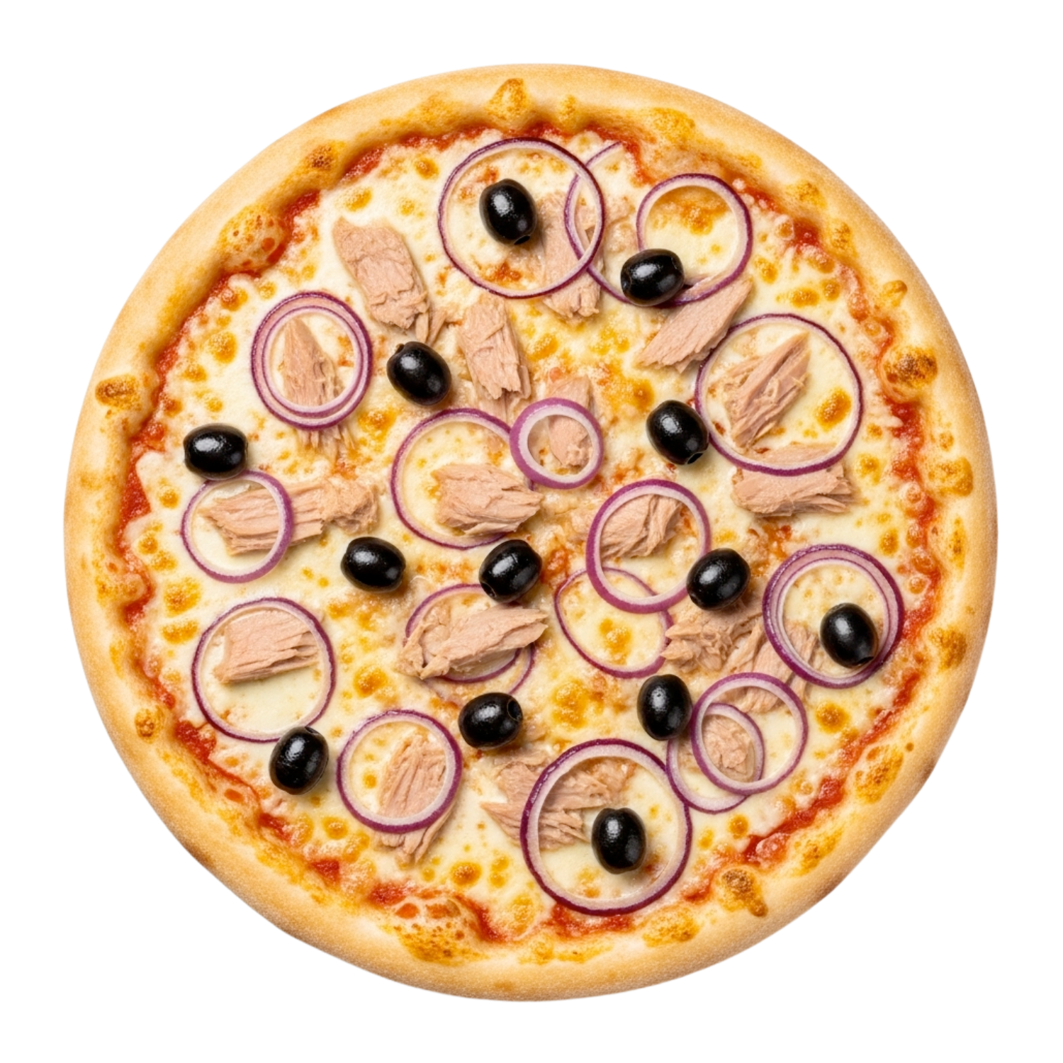 Mozzarella, emmental, oignons rouges, thon, olives.